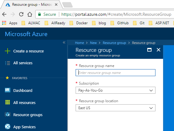 Go to the Azure portal, click on "Create Resource", do a search for "Resource Group" and click on the Create button. You should see a screen that looks like this: