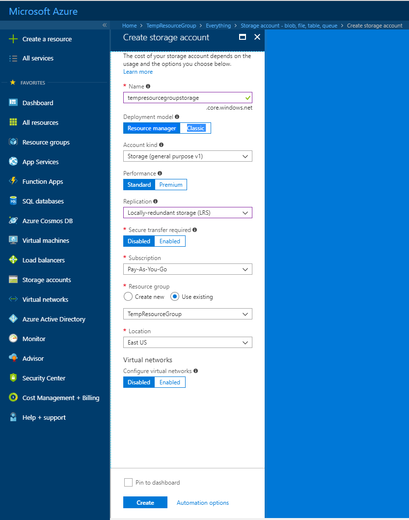Name your storage account (it needs to be unique within the .core.windows.net domain) and choose these options: