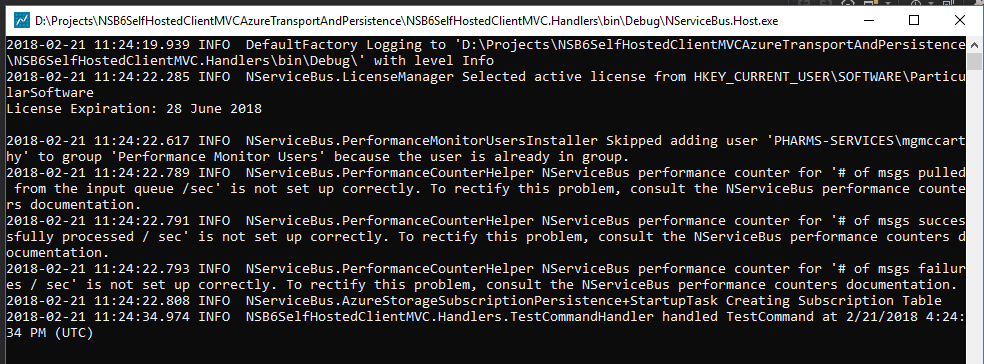 Check the NServiceBus Console window to see verify the "TestCommandHandler handled Test Command" has been logged: