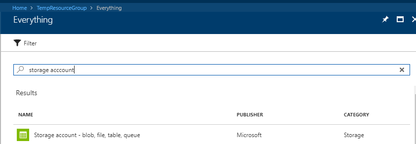Do a search for "storage account", pick "Storage account - blob, file, table, queue" and hit the Create button