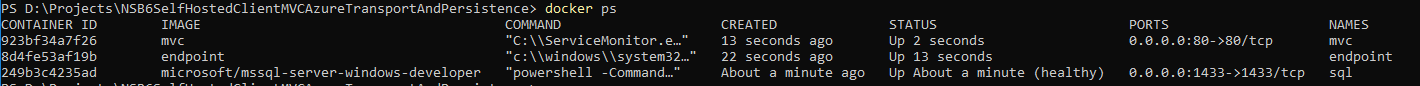Future posts in this series might include migrating to MSMQ as the NServiceBus transport (when it becomes available as part of the stable microsoft/aspnet:4.7.1-windowsservercore image on DockerHub) and/or deploying this application to the cloud in with Docker Swarm or Kubernetes.