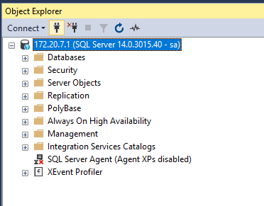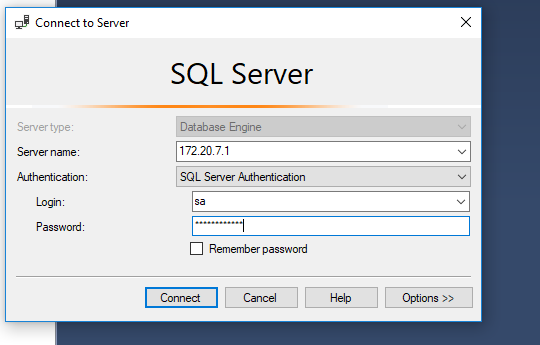 and fire up Sql Server Management Studio. Once SSMS opens, paste in the IP and the password used when starting the container. You should be able to connect to the sql server instance in the container.