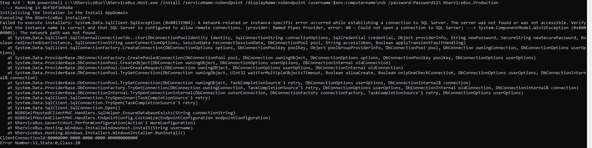 The failure was within the setup of NServiceBus.Host in the endpoint image. Regardless of whether the NServiceBus.Host is started (default behavior) or not after it's installed, the host will attempt to create all the resources it needs for NServiceBus's transport and persistence. In my case, since the NServiceBus.Host was being installed as part of the image, but I needed a running sql server container in order for the NServiceBus.Host to create a database and schema for Sql Persistence, and that container was not running, I was receiving this exception.