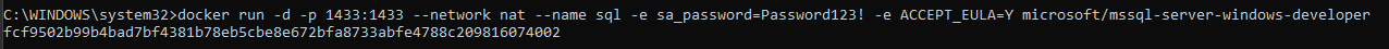docker run -d -p 1433:1433 --network nat --name sql -e sa_password=Password123! -e ACCEPT_EULA=Y microsoft/mssql-server-windows-developer