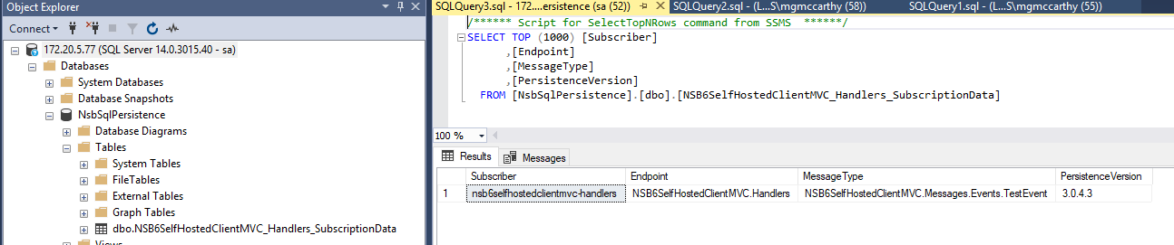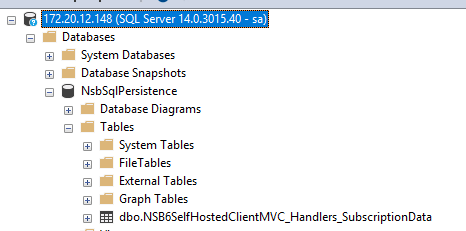 Looking the the database, you'll see the subscription entry in the dbo.NSB6SelfHostedClientMVC_Handlers_SubscriptionData table that contains the message to which the NSB6SelfHostedClientMVC.Handlers endpoint is subscribed: