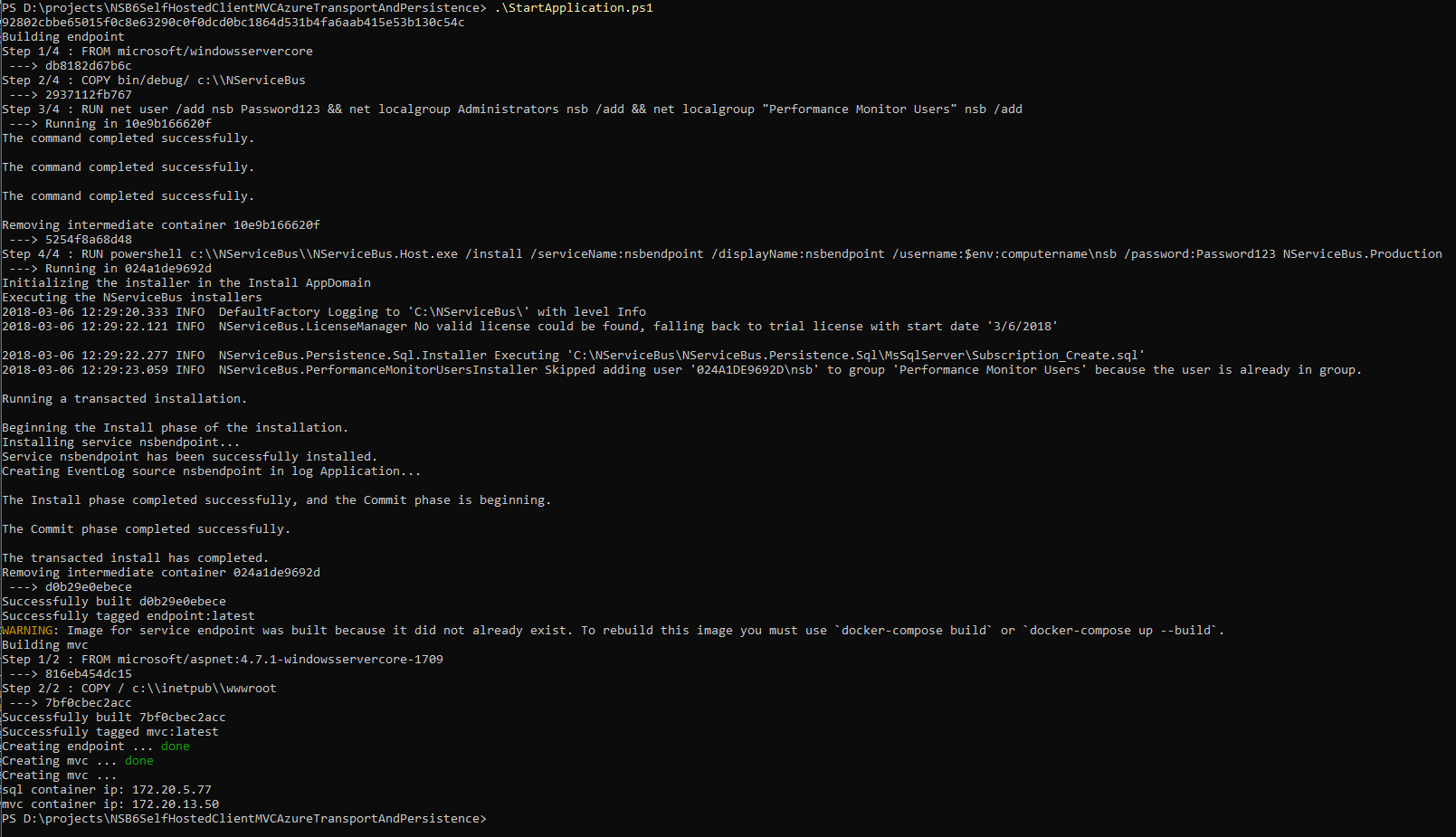 In the first line, the id of the sql server container is returned to the console, then the PowerShell script executes docker-compose up -d which creates the endpoint and mvc images and then starts those containers.