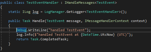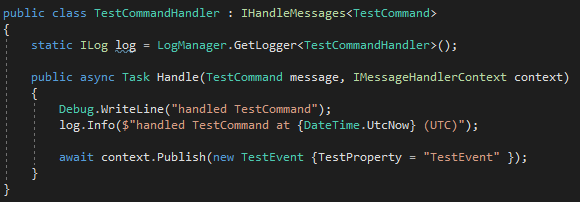 To illustrate how splitting the needs of NServiceBus transport (currently being handled by Azure Storage Queues) and NServiceBus Persistence (Sql Persistence) impacts the technical artifacts created by each respective technology, I've opted to add a new event, TestEvent, that is published at the end of TestCommandHandler, and handled in new handler, TestEventHandler.