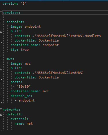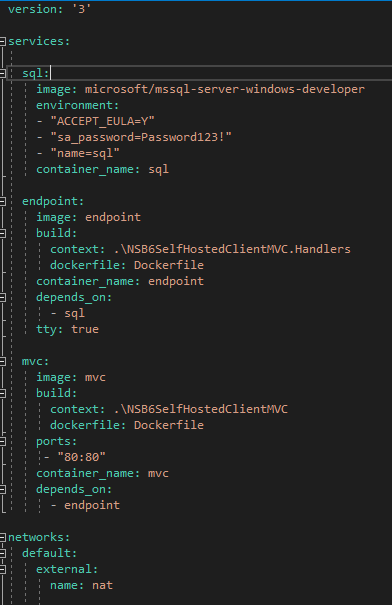 networks: I alluded to this in the previous section when talking about passing innatfor the--networkparameter.natis the default network created in which your containers will run if you do not specify other network options in Docker. Since I need all three of my containers to talk to each other, I specify the that all three containers use the same network name (nat) at the end of the yml file.depends_on: this allows containers to be "ordered" for startup. In this case, I need the sql server container created first so the endpoint container can use it for NServiceBus persistence. I need the mvc container to start last, because the endpoint container runs theSqlHelper.EnsureDatabaseExists(connection);check to build the persistence database and schema.